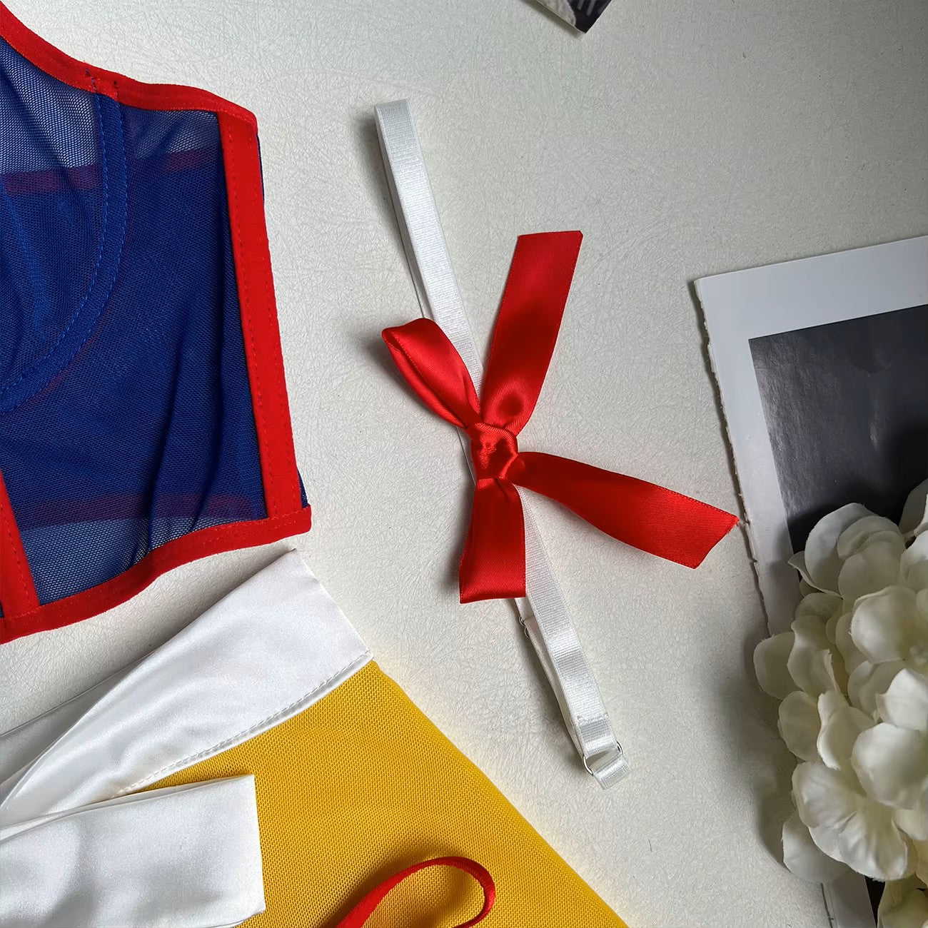 Klasyczna niewinność w zmysłowym wydaniu. Gorsetowa, granatowa góra z głębokim dekoltem subtelnie podkreśla linię ramion, kontrastując z lekkim, żółtym dołem o zwiewnym kroju, który porusza się przy każdym kroku. Czerwone akcenty dodają całości ognistego uroku.