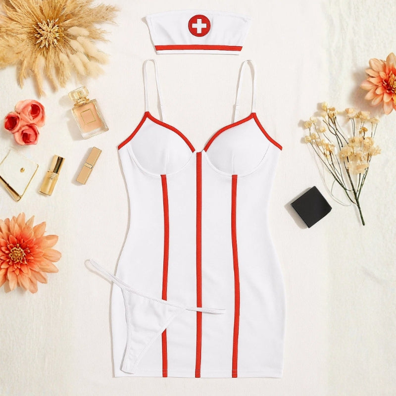 Biała niewinność z domieszką niebezpiecznego uroku. Krótka, dopasowana sukienka z głębokim dekoltem oplata ciało, podkreślając każdą krzywiznę. Czerwone detale – guziki, krzyż i lamówki – nadają charakteru i przyciągają wzrok, a przezroczyste elementy i satynowe wykończenia potęgują zmysłowy efekt. Czepek i stetoskop? Tylko dopełnienie tej odważnej fantazji.
