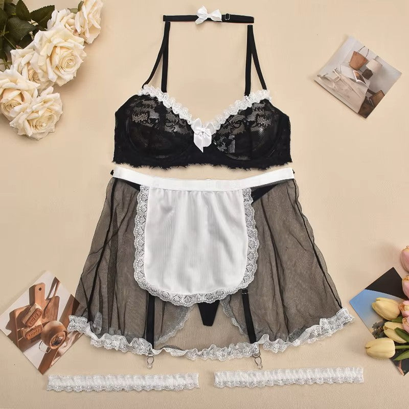 Porządki jeszcze nigdy nie wyglądały tak kusząco. Czarno-biały zestaw z delikatnej koronki i transparentnego materiału odsłania więcej, niż ukrywa – lekki fartuszek ledwie zakrywa biodra, a biustonosz z koronkowym wykończeniem przyciąga spojrzenia niczym magnes. Każdy detal – od kokardki na szyi po falbanki na brzegach – dopracowany, by wzbudzać fantazje.