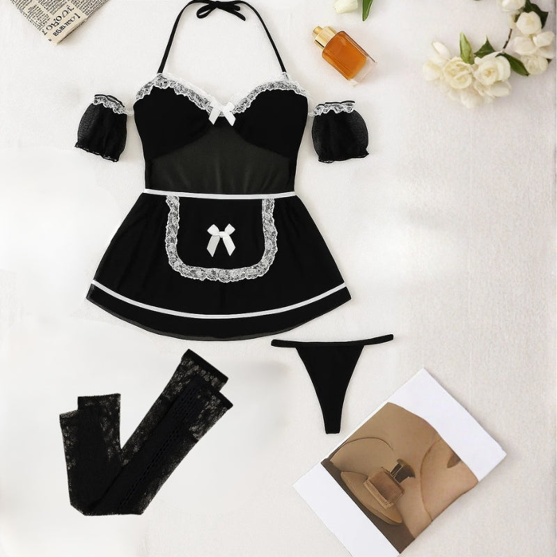 Klasyczna funkcjonalność przełamana zmysłowym wdziękiem. Dopasowana, czarna mini-sukienka z połyskującego materiału idealnie podkreśla talię, a białe, koronkowe wykończenia dodają całości frywolnego uroku. Głęboki dekolt i króciutki krój odsłaniają więcej, niż zakrywają, igrając z wyobraźnią. Pończochy z podwiązkami i mały fartuszek tylko pozornie łagodzą pikantny charakter stylizacji.