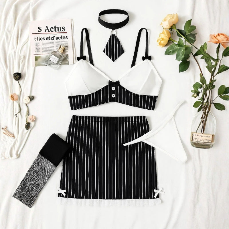 Biuro w wersji, która przyspiesza tętno. Dopasowany biały top z głębokim dekoltem zmysłowo opina ciało, podkreślając linię biustu i talii. Ciemna, mini spódniczka eksponuje nogi i dodaje elegancji z nutą dominacji. Dodatki w postaci okularów, pończoch z koronką czy cienkiego krawata wprowadzają subtelny flirt z konwencją, łącząc dyscyplinę z wyrafinowanym uwodzeniem.